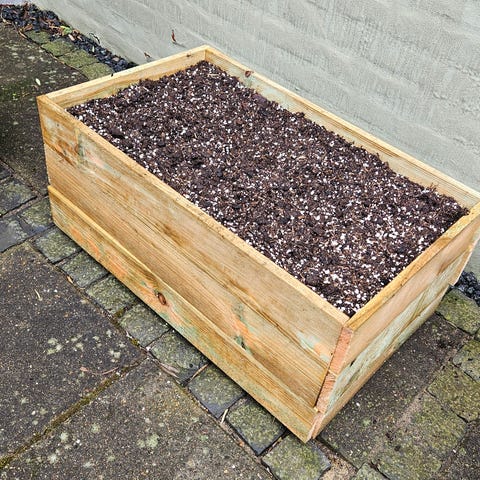 (Lavet i alm træ, med plade i bunden med huller i, så vandet kan løbe ud. Og plasticfolie indvendigt, så træet holder længere. Malet med træbeskytttelse)