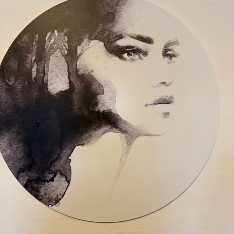 Plakat af akvarel, D. Michel, motiv: To kvinder på spadseretur i solskin