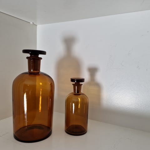 3 stk. Apoteker glasflasker i forskellige farver og størrelser.