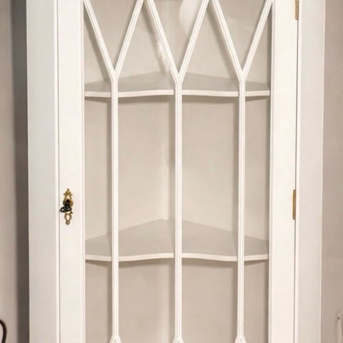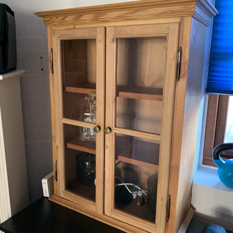 Hængevitrine, Skønneste gamle vitrineskab i egetræ med så mange flotte detaljer. Skabet er nymalet i Jotuns Soothing Beige både indeni og udenpå. Det originale grønne glas er bevaret og de gamle nøgle beslag ligeså.