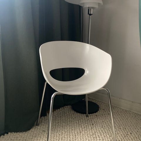 Anden arkitekt, stol, SINTESI ORBIT, Seks brugte stole med skal af klar plastik (technopolymer) og ben af forkromet stål. Fremstillet hos SINTESI i Italien, model ORBIT. Bemærk afrundet overkant dvs. mere behagelige at sidde i. Siddehøjde: 48 cm. Total højde: 80 cm. Bredde: 54 cm. Samlet pris afhentet.
