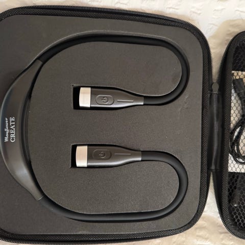 Bruger du dine aftner på strik eller hækling, behøver du god belysning. Infinity Hearts LED Nakkelampe / Håndledslampe kan både bruges om håndleddet og som nakkelampe. Nakkelampen måler 85 cm og har en lampe i hver ende. Hver lampe består af tre små pærer. Den tændes ved et tryk på en knap i siden af hver lampe. I lampen er der, fire batterier i hver lampe. Batterierne sidder allerede i lampen. Det er nu muligt at udskifte de fire LR44-batterier. Den er lavet af sort aluminium, som er nem at bøje. De fleksible arme kan justeres, så lampen får den ideelle position.