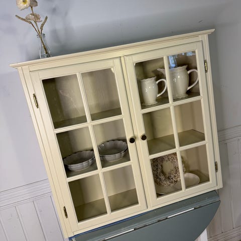 VITRINESKAB m/2 LÅGER, GAMMELT, TOTAL istandsat med god interiørmaling og oprindelige gamle blyruder - SÅ SMUKKE. Højde ca 100 cm, bredde ca 94 cm, dybde øverst 26 cm. På bagsiden er monteret ophæng til væg. Se fotos.