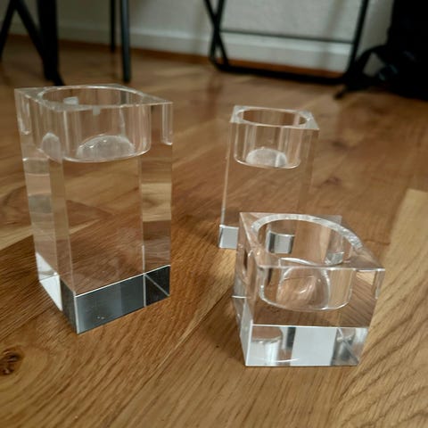 Stagerne er sølv, med et fint mønster, og gennemsigtig glasfod.