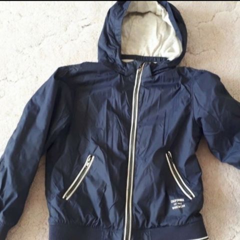 Flot vindjakke i sort/beige i str. 152 fra H&M. Vores søn nåede kun at bruge den 2-3 gange, inden han tog en vækstspurt og voksede ud af den. Jakken fremstår derfor fuldstændig som NY.