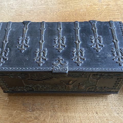 SKRIN MED RIDDERE, BRONZE, 100 år gl., FLOT BRONZE SKRIN MED KÆMPENDE RIDDERE.