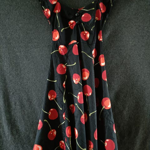 Festkjole, Hearts & Roses, str. XL, Sort med røde roser, God men brugt, Fineste rockabilly kjole i bedste 50’er stil med sort satinbånd som bælte. Fin både med og uden petticoat/tylskørte. Størrelsen er angivet til 44, men nok nærmere end 42.