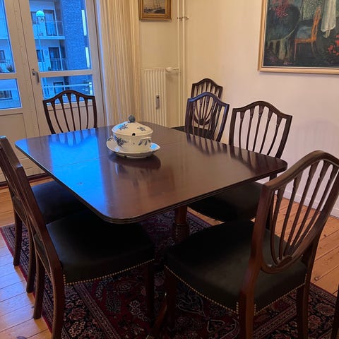 Spisebord m/stole, Maghonie, Hepplewhite, Hepplewhite spisestue bestående af spisebord +lille tillægsplade samt 6 stole.