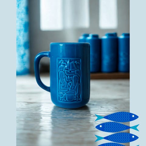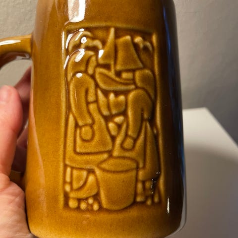 Stentøj, Krus, Michael Andersen, 6172 med gylden glasur, 12 cm høj og 8 cm i dia. Deco. med 2 forskellige motiver.