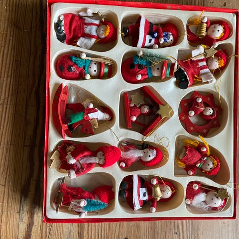 Udskåret træpynt, helt nyt, aldrig brugt, håndlavet i Estland. 6 stk., ca. 6-7 cm høje, fine detaljer, i fin juletræsæske. Samlet pris.