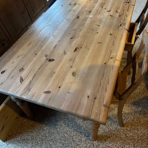 Massiv håndlavet bord og 6 stole, Møbelsnedker c. Jensen og søn Brovst, Massivt bord med udtræksplader samt 6 tilhørende stole fra Nibe Købmandsgård.