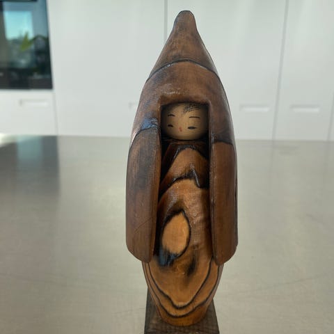Figur, Saiko, motiv: Menneske, Lerfigur - menneske - siddende på hug med med arme om benene 12 cm. Blå farve.