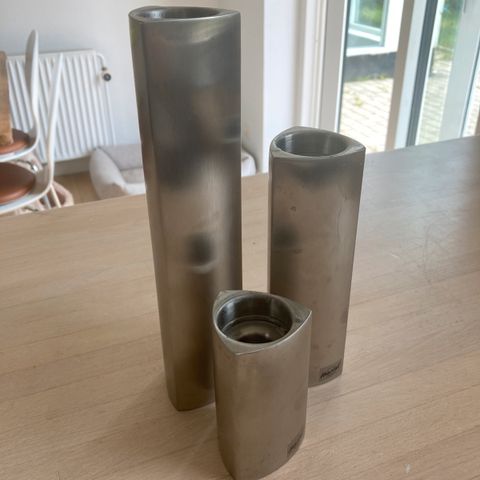 Lysestage, 3 stager i rustfri stål. Kan bruges til både fyrfadslys og almindelige lys. Højde 25, 17 og 10 cm. Jeg mener at de er fra Herstal.