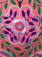 Gobelin, broderet billedtæppe, Kené-art håndlavet af Shipipo-stammen fra Peru. Forestiller ayahuasca og chacruna blade og to slanger (der renser negative energier) og icaros omkring.
