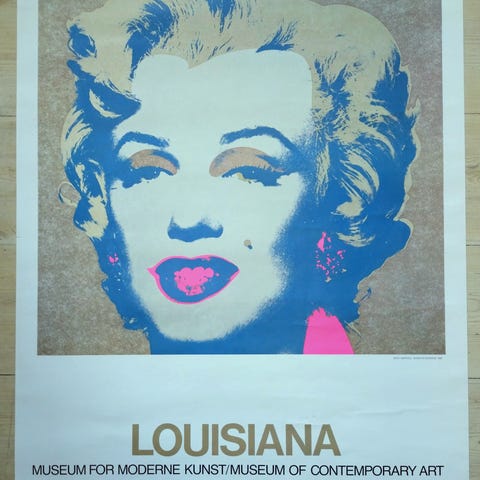 Plakat, Andy Warhol, b: 62 h: 100, Udstillingsplakat - Louisiana. Med enkelte små defekter som fx en lille revne i øverste hjørne og et par krøllede ender, men ikke noget der stikker i øjnene. Sendes fragtfrit i DK.