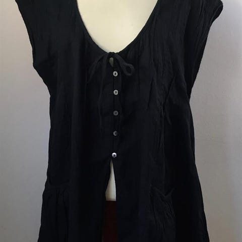 Gudrun Sjöden skjorte M i lidt kraftig vævet viscose, perlemorsknapper og rundet underkant. Sort i bunden. Næsten som ny. Bryst 55cm. Længde 66cm. Ærme indersøm fra armhule til kant 48cm. Ærme skulder til kant 62cm. Vejer 150g.