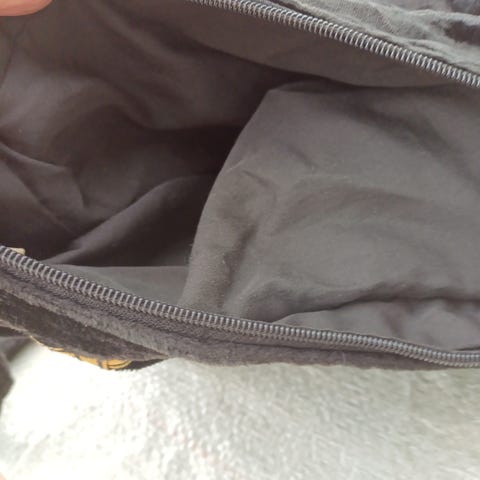 Tasken lukkes med lynlås ( 16 cm. ) der er et løst hæklet stykke, der dækker for lynlås. Se billeder.