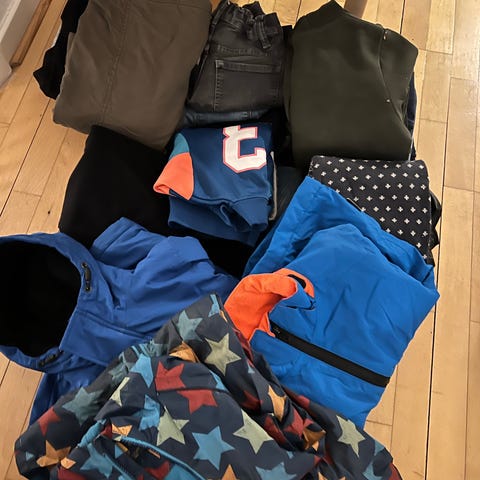 Pakke med blandet drengetøj (10-12 år), indeholder bl.a. 2 langærmet skjorter, 3 kortærmet skjorter, én brugt og én helt ny polo, én hoodie, en hummeltrøje, en vest, shorts, to par pæne bukser, et par overtræksbukser og en masse bukser (7 blå jeans, 2 grønne vandrebukser, et par sorte jeans, og to grå bukser), og slutteligt ét bælte.