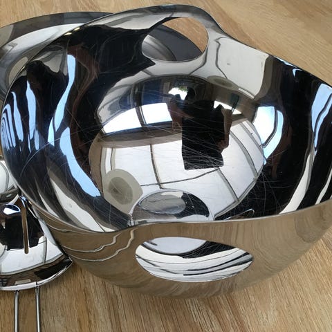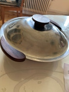 Rustfri skål, Rustfri skål ø 22 højde 10 cm med greb på låg og skål tror det er palisander skål ø 25 højde 13 cm også greb i palisander sælges samlet