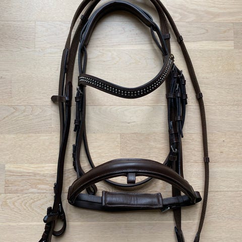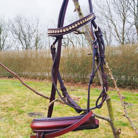 Trense, Equiline trense, Jeg sælger en equiline trense og tøjler. Sælges helst sammen hvis muligt. str. COB passer til en kat 1 pony. Den er lidt brugt men stadig i super fin stand. Ny pris 2.899,-