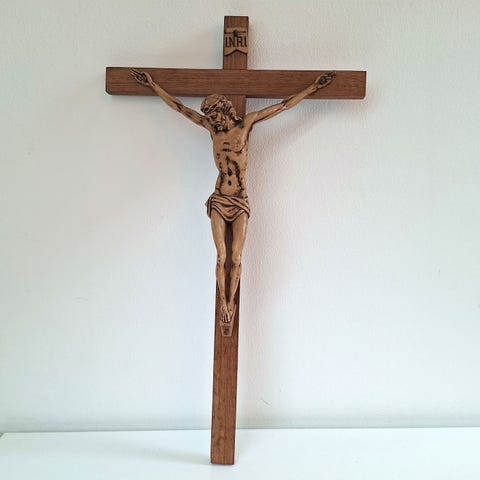 Gammelt fransk metal krusifiks på fod, med en slange, der snor som omkring foden. H 42 cm. Den ene arm på figuren er limet