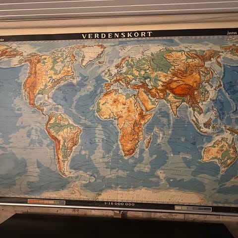 Verdenskort, Nordisk korthandel, Originalt verdenskort. Har hængt på skole til undervisningsbrug. I pæn, brugt stand med lidt slid forneden, hvor kortet har løsnet sig lidt fra trælisten. Kortet sidder på en metal rulle, så det kan justeres i højden. Det måler som minimum 138 cm i højden og 206 cm i bredden med trælisten. Fra hjem uden røg og parfume. Kortet skal afhentes.