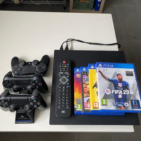 Playstation 4 Pro, Pro, Selger PS4 pro, og to kontroller.