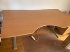 Skrive-/computerbord, b: 180 d: 90, Stort skrivebord med elektrisk justerbar højde. Listen har givet sig lidt, men kan klistres tilbage med lim. Til bordet er der en tilhørende mobil skuffekassette med drejehjul og lås ( h 69, 48x48) som er med i prisen.