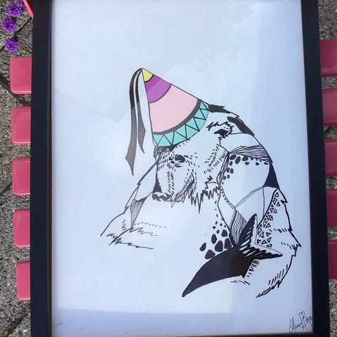 Grafisk tryk af Anja Kiersgaard i glas og ramme (passepartout skal udskiftes da det buler lidt i nederste højre hjørne), B 60, H 58 cm