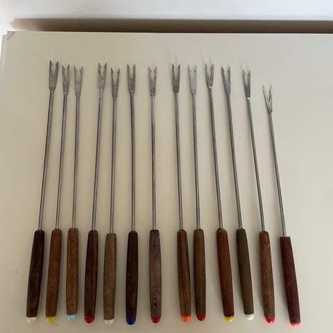 Teak på håndtaget og gafler i metal, fine lange til at sætte i fonduegryde- eller bruge dem til tapas på et Tapas-fad