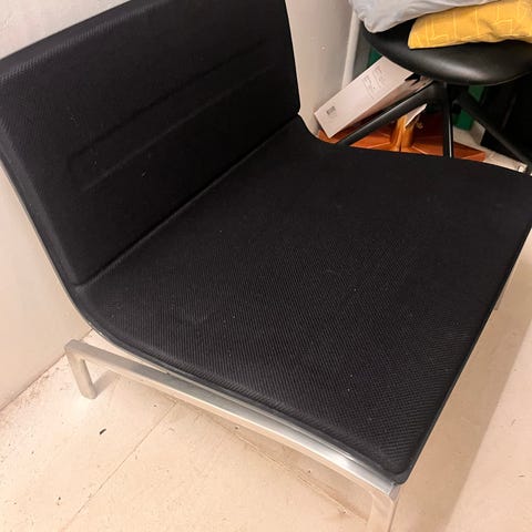 Den har desværre en lille defekt på fronten af stolen, hvor en lille lap af stoffet er i stykker. Måske man kan sy det sammen hvis man et lidt dygtig.
