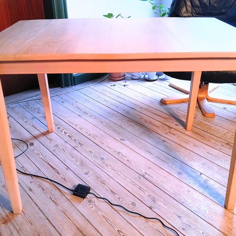 Skrivebord/spisebord, Ikea. Brugt som skrivebord i vores sommerhus i Ebeltoft, hvor det stadig står.