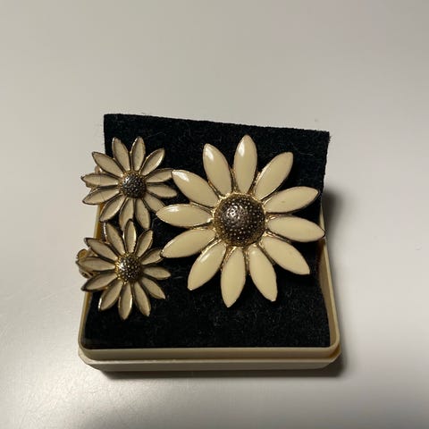 Smykkesæt, bijouteri, Marguerit, Vintage smykkesæt bestående af broche og øreclips med Margueritter i gyldent metal med emalje.
