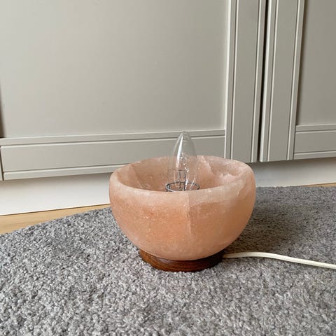 Saltsten lampe - obs tidligere en lampe, du kan bruge den som den er eller sætte elektricitet i igen så har du en fin lampe. Står på teaktræ fod.