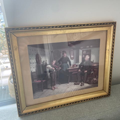 det ene med motiv fra rum til rum. På Lærred Jeg kan ikke tyde navnet. Se billederne 70x65 læg mærke til billedet over det lille skab, hvor motivet går igen, igen , igen .....