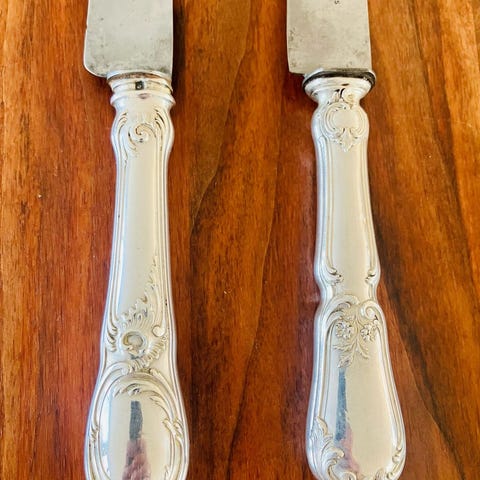 Sølvtøj, 2 frugtknive , HS, Er det mon Hermann Siersbøll? 2 virkelig smukke gamle knive i 3 tårnet sølv med Raadvad stål blade. Længde 17,3.