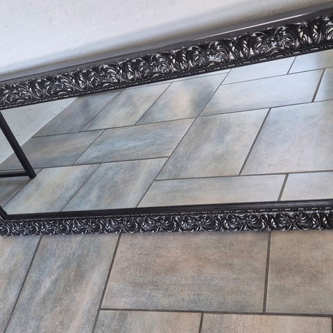 Spejl, Nydeligt spejl med pynt og overbygning af sort metal.