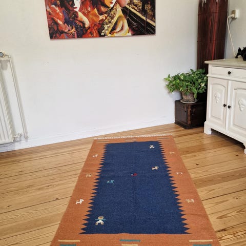 Løse tæpper, Uld, b: 112 l: 146, Smukt ægte vintage kelim, hjembragt fra Tyrkiet for år tilbage. Vendbar. Slidt på den ene kant (se foto) deraf prisen. Kunne godt trænge til en rens/god gennembankning. Måler ca 112x146 cm uden frynser.