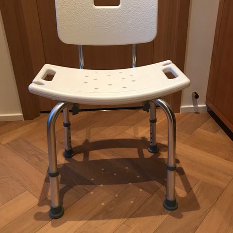 Badestol. Stolen har en enkel konstruktion med metalben og et blåt sæde. Siddehøjden er 45 cm, og stolen er designet til alsidig brug.