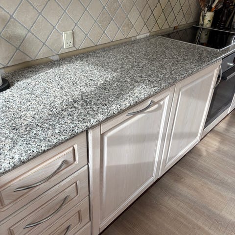 Bordplade, Granit, 142 lang og 61,5 bred 30 mm tyk. Til evt udekøkken. Poleret forkant og venstre side. Højre side ikke poleret.