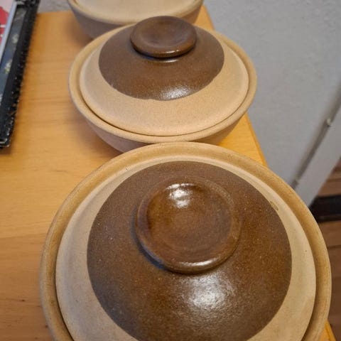 Gryder/skåle, VULCANUS, En gryde med låg, 3 forskellige små størrelser af af skåle. Vintage Norsk 1970'er blå Figgio Flameware VULCANUS - Keramisk stentøj, grydegryde, med flerfarvet Tor Viking design.