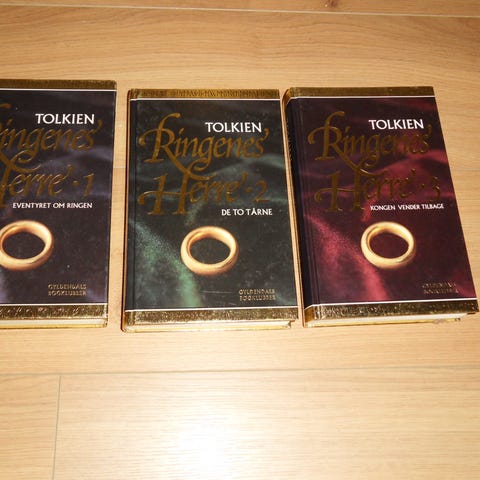 Ringenes Herre Trilogi Hardback Tolkien, J R R Tolkien, genre: fantasy, Gyldendal 2002. 3 bind. Komplet. Hardbacks. Overfladiske ydre brugsspor. Udgaven med guldring på coverets forside. Sort med kanter i guld med runeskrift.
