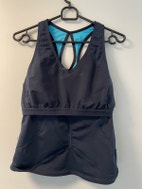 Toppen er i mørkeblå stretch materiale med draperinger i net fra bryst.