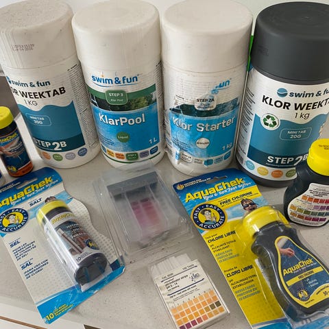 Der er termometer, dispenser til tabletter o.lign, pH-værdi måler, granulat, no mold, samt pH+ og pH-, gummiænder til rensning og vedligeholdelse af pool og vand.