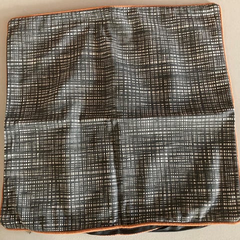 Pude, Inhome, Inhome pude + pudebetræk 42 x 42 cm. Betrækket er forskellige nuancer af grå på hhv. front og back, en lys grå og en mørk grå. Pudden har en sort læderkant.