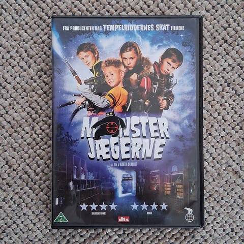 Monsterjægerne, instruktør Martin Schmidt, DVD, familiefilm, Fra 2009. Med bl.a. Carl Christian Winther, Toke Lars Bjarke, Lærke Janken, Mathias Mandrup Larsen, Sara Mering, Peter Mygind, Mette Agnete Horn, Kjeld Nørgaard, Paw Henriksen, Anna Neye, Robert Hansen, Jonas Schmidt, Pilou Asbæk, Peter Gilsfort og Jes Dorph-Petersen.
