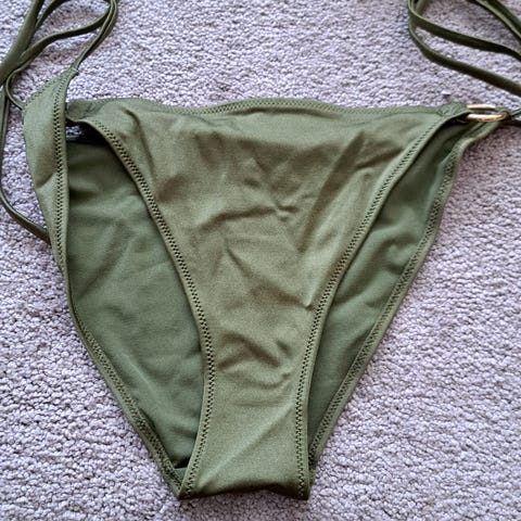 Smukt bikinisæt i sommerlige farver. Underdelen bindes i siderne og kan derfor justeres i størrelse. Kan sendes.