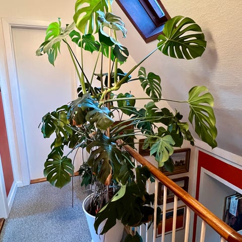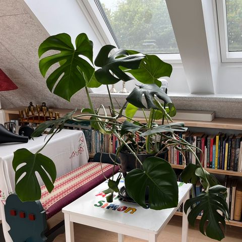 Fingerphilodendro monstera, Fantastisk flot grøn stueplante Fingerphilodendro Monstera , den er meget stor, og er lige blevet plantet om, den står i en fin hvid metal spand med træhank. Meget dekorativ. H 140 cm