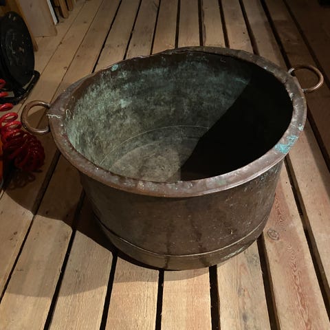 Gruekeddel kobber, Rustik kobber gruekeddel / spand til opbevaring af brænde, puder, tæpper mm. Højde 26 cm, Ø 45 cm.