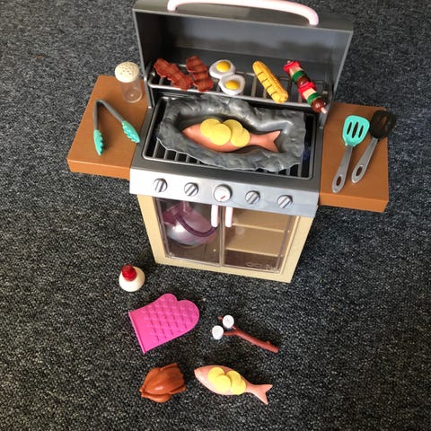 Havespil, Lege grill, Fin legetøjs grill i plastik, der følger lege kul - 2 stk pølser - 2 tallerkner og bestik med